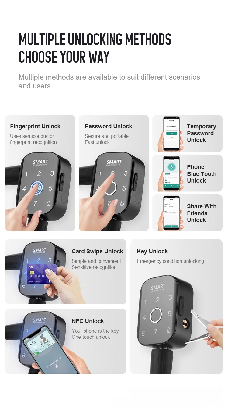 1.Access by Fingerprint, Passcode, Bluetooth App, IC Card, Temporary Password, or Mechanical Key.