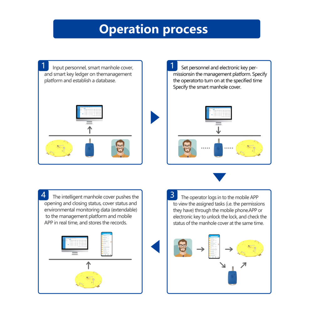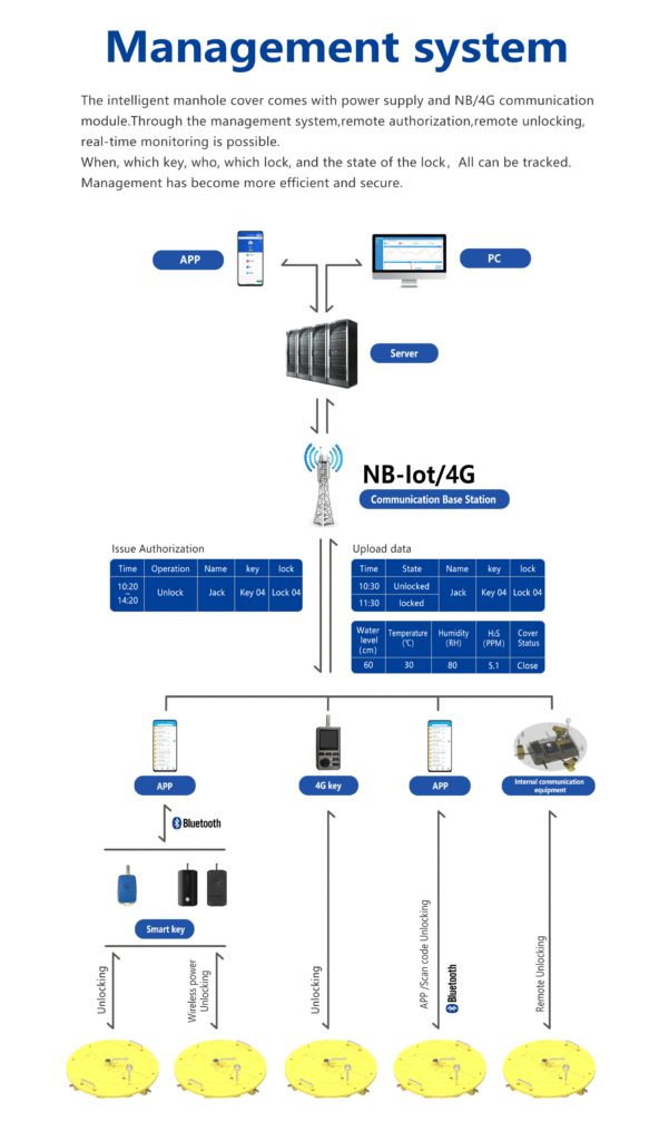 Bluetooth unlocking, emergency unlocking, and other unlocking methods.Ensure that the smart manhole cover can be opened smoothly under any circumstances.